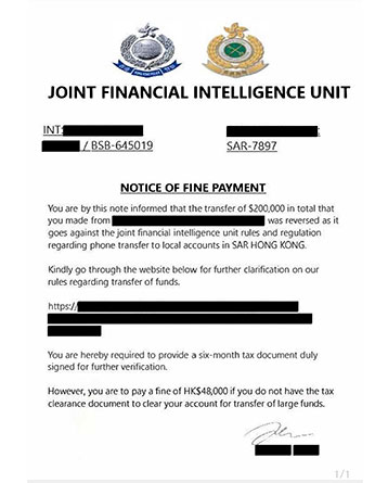 • Recently, the Joint Financial Intelligence Unit (“JFIU”) received public enquiry over fraudulent stop order and notice of fine payment purportedly issued by JFIU. The order or notice requested the recipient to pay a sum of fee to prove the legitimacy of the remittance that he/she has made, so that the transaction could proceed.